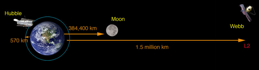 마지막으로 두 망원경은 놓인 곳이 다릅니다. 허블 우주 망원경은 지구와 약 570km 떨어져 있지만, JWST가 놓일 곳은 약 1백50만 km 떨어진 지점이에요. 달보다도 훨씬 멀리 있죠. JWST가 놓인 곳은 라그랑주 점이라는 곳 중 하나(L2)입니다. 항상 태양이 지구에 가려져 있기 때문에 태양광이나 태양열의 영향이 적습니다. 또한 태양과 지구, 달의 중력이 균형을 이루기 때문에 안정적으로 그 자리에 머무를 수 있고, 따라서 연료 소모도 줄일 수 있습니다.