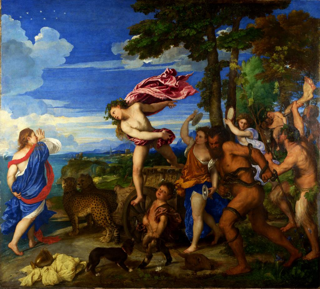 티치아노 베첼리오는 르네상스 시대 유럽 최고의 화가로 이름을 날렸던 사람이다. 종교, 역사, 고전, 초상화 등 장르를 가리지 않고 당대 최고의 화가가 되어 신성로마제국의 황제인 카를 5세의 총애를 받던 그의 작품은 지금까지 미술사적으로 큰 의미를 가진다고 한다. 그의 작품 중 바쿠스와 아리아드네는 북쪽왕관자리 신화 속 한 장면을 보여주고 있다. 신화 속 영웅 테세우스에게 버림받은 아리아드네는 상심하던 도중 술의 신 디오니소스(바쿠스)의 청혼을 받게 된다. 오른쪽에 그려진 추종자들과 가운데에서 역동적인 모습으로 나타난 디오니소스의 모습이 인상적이다. 왼쪽 윗 편을 자세히 살펴보면 작은 점들이 별자리처럼 동그랗게 모여있는 것을 볼 수 있다. 이는 디오니소스가 선물한 북쪽왕관자리로 알려져 있다. 티치아노는 신화 속 장면에 별자리를 포함 시켜 그 모습을 완성 시킨 것이다.