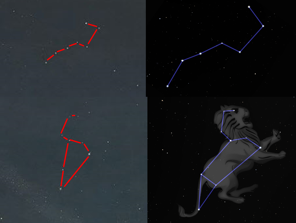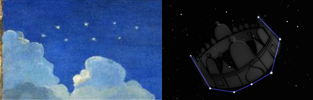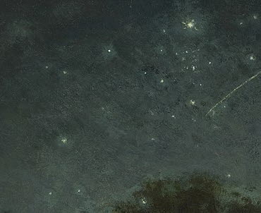 엘스하이머는 17세기 초에 활동한 독일의 화가로 32살의 젊은 나이에 생을 마친 비운의 천재이기도 하다. 그가 죽기 1년 전에 완성된 이집트로의 피신은 최초의 밤 풍경화로도 많이 알려진 작품이다. 유대 왕 헤롯의 영아 학살을 피해 이집트로 피난을 가는 성 가족의 모습을 보여주고 있다. 그림 속 하늘에는 아주 흥미로운 점이 많이 있는데 일단 은하수가 무수히 많은 별로 구성되어 있다. 추가적으로 별자리 역시 그 모습을 제대로 보여주고 있다. 그림의 정중앙에 밝게 보이는 것이 사자의 심장인 레굴루스이다. 그 별 주변부로 사자자리의 형상이 어렴풋하게 보인다. 한쪽 구석에는 북두칠성으로 보이는 모습이 정확하게 눈에 띄는데 4번째 별(메그레즈)이 가장 어두운 것까지 그럴듯하게 표현했다. 이렇게 다양한 천문학적 요소들이 들어간 그림이지만 엄밀히 말해서 그 위치가 잘 고증이 된 것은 아니다. 사자와 큰곰 두 별자리의 위치와 은하수의 위치는 실제와 상당한 차이를 보인다. 거기에 저렇게 밝은 보름달과 은하수가 동시에 보이는 것 역시 실제로는 불가능에 가까운 일이다. 이는 작가가 별자리 및 밤하늘 모습을 따와서 상징적 의미를 담아 사용하였기에 생긴 현상이다. (이 그림이 성경 속 장면을 담아 종교적 색채가 짙은 작품이라는 것을 보면 쉽게 알 수 있다.)
