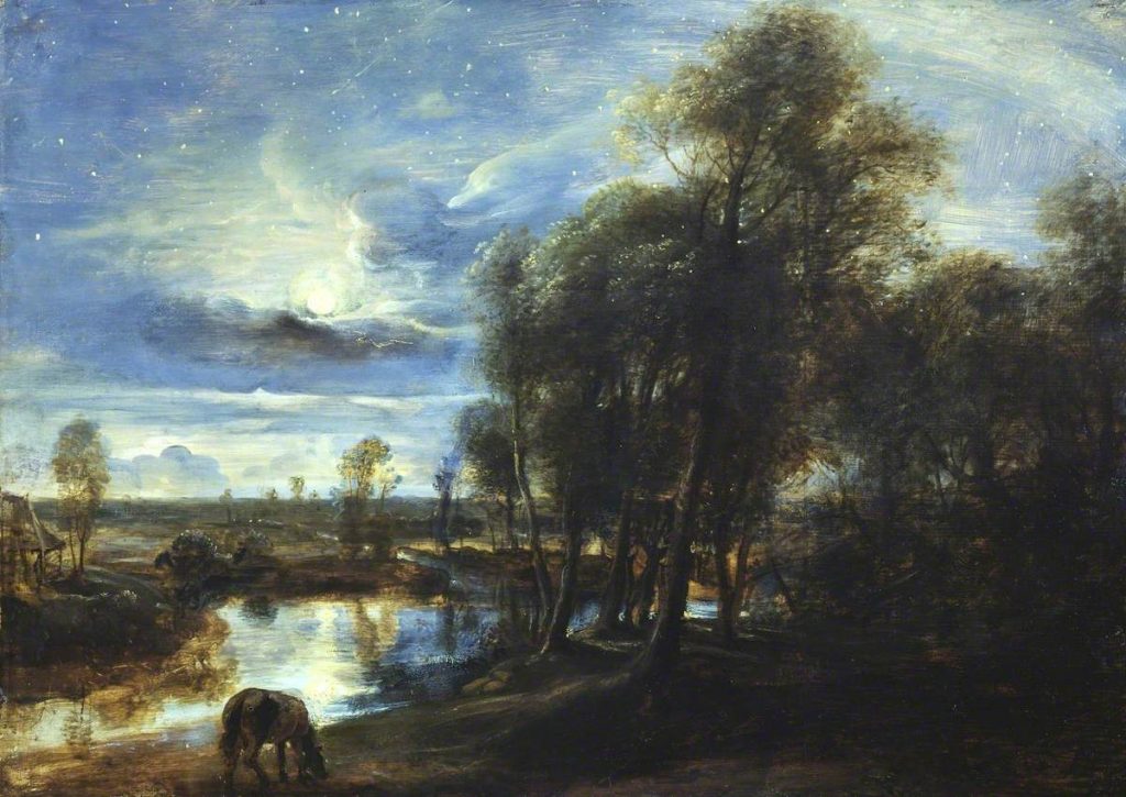 루벤스는 아담 엘스하이머와 같은 시기에 활동한 네덜란드의 화가이다. 엘스하이머와 달리 화려한 삶을 산 루벤스는 바로크 양식의 대가로 이름을 높였는데 그의 그림에 영향을 준 사람 중 한 명이 바로 엘스하이머였다고 한다. 루벤스의 말년에 그려진 달빛 풍경에는 앞서 소개한 이집트로의 피신처럼 어둑어둑한 하늘이 표현되어 있지는 않지만 밝게 빛나는 달과 푸른 빛 하늘에 무수한 별이 잘 표현되어 있다. 그리고 여기에서도 다양한 별자리의 형태를 만나볼 수 있다. 대표적으로 그 모습을 쉽게 확인할 수 있는 별자리는 카시오페이아자리와 전갈자리이다. 나무 위쪽으로 똑바로 서 있는 전갈의 모습과 반대편 하늘에 누워있는 카시오페이아의 형태가 눈에 띈다. 다만 이 그림에서도 별자리의 위치는 그다지 고증되어 있지 않다. 가을철에 주로 보이는 카시오페이아와 여름철에 보이는 전갈자리가 한 하늘에 나타나려면 거의 북쪽과 남쪽 하늘 정 반대편에 위치해야 한다. 마찬가지로 그 사이에 위치한 아주 작게 표현된 오리온자리는 심지어 겨울철 별자리이니 절대 한 번에 보일 수 없는 것이다. 이는 약 5년에 걸친 그림 제작 기간 도중 보인 많은 별자리를 한 번에 표현하다가 생긴 현상이 아닐까?