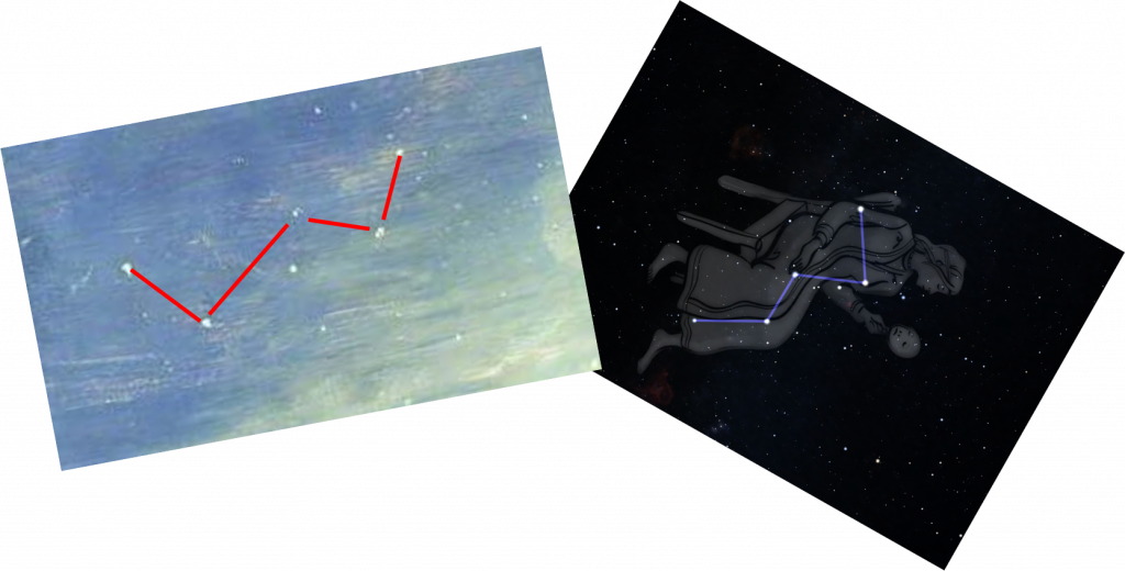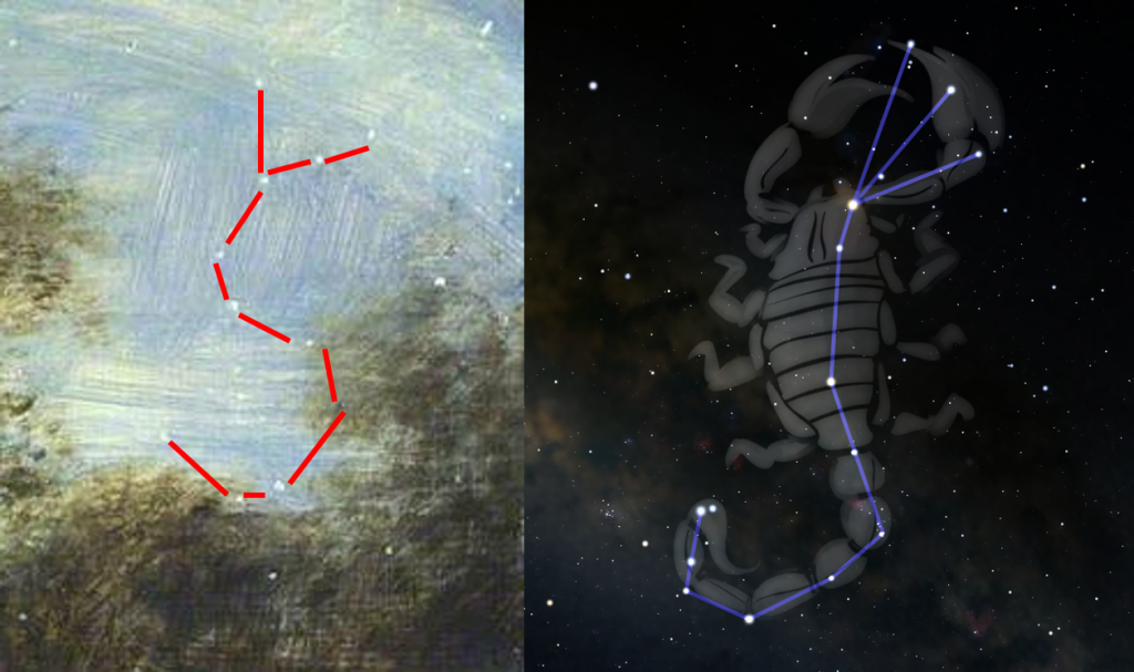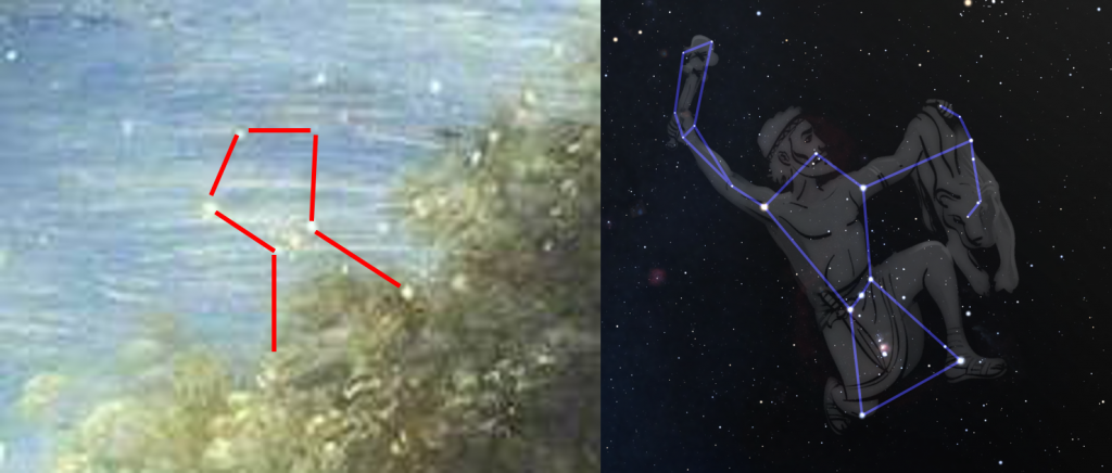 밀레는 19세기를 대표하는 프랑스의 화가로 이삭 줍는 여인들, 만종으로 유명하다. 그의 그림 중 별이 빛나는 밤은 아름다운 밤하늘에서 떨어지는 별똥별 모습까지 뚜렷하게 그려져 있다. 그가 밤 산책을 하면서 본 풍경을 그린 그림이라고 하는데 여기에서도 별자리가 숨어있는 것을 볼 수 있다. 오른쪽 별들 사이에서 오리온의 벨트가 뚜렷하게 보인다. 다만 벨트 아래 의문의 밝은 별이 있는데 위치상으로 오리온의 1등성인 리겔이라고 하기에도 애매하다. 반대편에 존재하는 밝은 별은 밤하늘에서 가장 밝은 별인 시리우스로 해석하는 경우가 있다. 그러나 이 역시 실제 위치상으로 보자면 작은개자리의 프로키온이 좀 더 정확해 보인다. ( 물론 주변부 별의 형태를 보았을 때 큰개자리로 보는 것이 타당한 것 같기도 하다. ) 이 역시 밀레가 그린 밤하늘이 정확한 한 시점을 표현한 것이 아니라 긴 시간이 켜켜히 쌓인 모습이어서 생긴 현상이 아닐까.