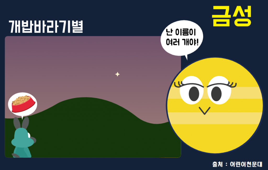 강아지가 초저녁에 밝게 떠오른 금성을 보고, “멍멍! 밥 주세요!”라고 외치는 것 같다고 하여 붙여진 금성의 또 다른 이름입니다. 실제로 금성은 스스로 빛을 내는 별이 아닌, 태양 빛을 반사하여 빛을 내는 행성이지만 말이죠.