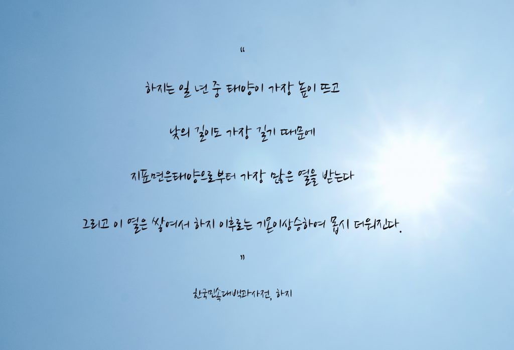 일 년 중 태양이 제일 높게 뜨는 시점이기 때문에 낮의 길이가 제일 긴 날이기도하지요.