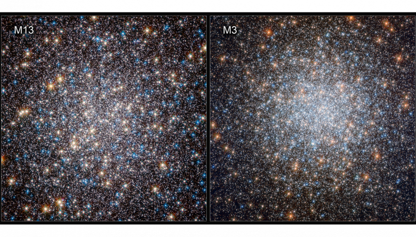 이번 논문을 발표한 연구진들은 우리 은하의 구상성단 M3과 M13을 연구 대상으로 선정했습니다. 두 구상성단은 나이(약 130억 살)와 금속 함량(수소와 헬륨보다 무거운 원소의 포함 정도)이 비슷하거든요. 간단히 보기엔 비슷했지만, 허블 우주 망원경의 광시야 카메라(Wide Field Camera 3)를 이용하여 성단을 관측한 결과 M13에 밝은 백색왜성들이 훨씬 더 많았습니다. 왜 그런 걸까요?