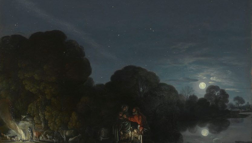 엘스하이머는 17세기 초에 활동한 독일의 화가로 32살의 젊은 나이에 생을 마친 비운의 천재이기도 하다. 그가 죽기 1년 전에 완성된 이집트로의 피신은 최초의 밤 풍경화로도 많이 알려진 작품이다. 유대 왕 헤롯의 영아 학살을 피해 이집트로 피난을 가는 성 가족의 모습을 보여주고 있다. 그림 속 하늘에는 아주 흥미로운 점이 많이 있는데 일단 은하수가 무수히 많은 별로 구성되어 있다. 추가적으로 별자리 역시 그 모습을 제대로 보여주고 있다. 그림의 정중앙에 밝게 보이는 것이 사자의 심장인 레굴루스이다. 그 별 주변부로 사자자리의 형상이 어렴풋하게 보인다. 한쪽 구석에는 북두칠성으로 보이는 모습이 정확하게 눈에 띄는데 4번째 별(메그레즈)이 가장 어두운 것까지 그럴듯하게 표현했다. 이렇게 다양한 천문학적 요소들이 들어간 그림이지만 엄밀히 말해서 그 위치가 잘 고증이 된 것은 아니다. 사자와 큰곰 두 별자리의 위치와 은하수의 위치는 실제와 상당한 차이를 보인다. 거기에 저렇게 밝은 보름달과 은하수가 동시에 보이는 것 역시 실제로는 불가능에 가까운 일이다. 이는 작가가 별자리 및 밤하늘 모습을 따와서 상징적 의미를 담아 사용하였기에 생긴 현상이다. (이 그림이 성경 속 장면을 담아 종교적 색채가 짙은 작품이라는 것을 보면 쉽게 알 수 있다.)