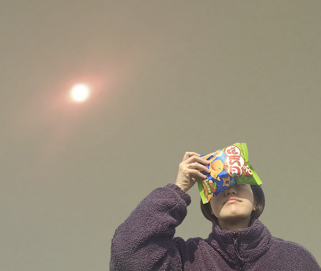 과자를 맛있게 먹은 후 빈 봉지를 버리지 마세요! 과자 봉지는 알루미늄으로 코팅되어 있는데, 알루미늄이 태양 빛 대부분을 반사하고 적은 양을 투과시켜, 편안하게 태양을 볼 수 있답니다.