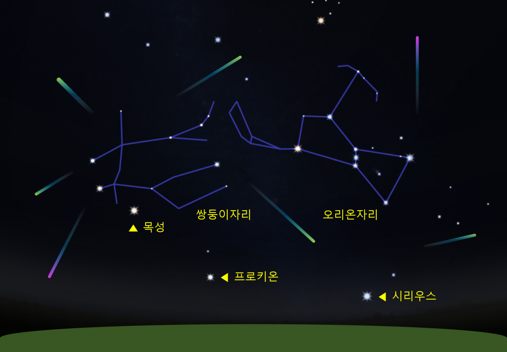 본격적인 겨울이 시작되면서 밤하늘에는 반가운 별자리가 떠오릅니다. 바로, 세 개의 별이 일렬로 줄지은 모습이 인상적인 오리온자리예요. 그리고 바로 왼쪽에는 쌍둥이자리가 함께 떠오르는데요, 쌍둥이의 머리를 의미하는 두 개의 별이 밝게 빛나고 있답니다. 그리고 쌍둥이자리 아래쪽에는 밤하늘의 별 중에서 가장 밝게 빛나고 있는 별이 있는데요, 사실은 별이 아닌 행성 ‘목성’이랍니다. 누르스름한 색으로 환하게 빛나며 존재감을 드러내고 있지요. 그리고 지평선 가까이 이제 막 떠오르고 있는 별, 시리우스를 볼 수 있어요. 시리우스는 밤하늘의 ‘별’ 중에서 가장 밝게 빛나는 별이랍니다. 푸르스름한 빛을 내는 시리우스는 한겨울의 시린 느낌을 담고 있는 별이지만, 실제로는 태양보다 훨씬 뜨거운 별이랍니다.