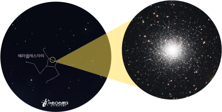 헤라클레스 구상성단은 사냥개자리 구상성단보다 훨씬 밝고, 더 많은 별들이 모여있는 구상성단입니다. 그래서 헤라클레스 대성단이라는 별명을 가지고 있기도 하죠. 쌍안경으로도 볼 수 있을 정도라고 하니, 6월의 여름밤에는 쌍안경을 들고 헤라클레스 구상성단을 보러 떠나보는 건 어떨까요?