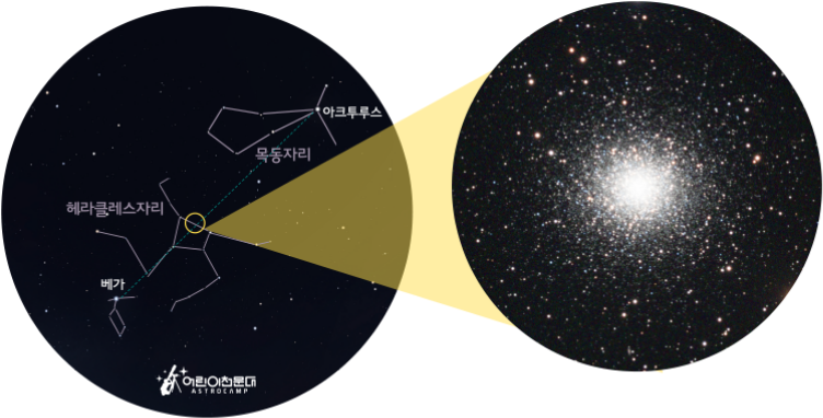 헤라클레스 구상성단은 거문고자리의 베가와 목동자리의 아크투루스를 찾아 두 별을 잇는 가상의 선을 그린 뒤, 베가에서 아크투루스 방향으로 1/3만큼 가면 찾을 수 있답니다.